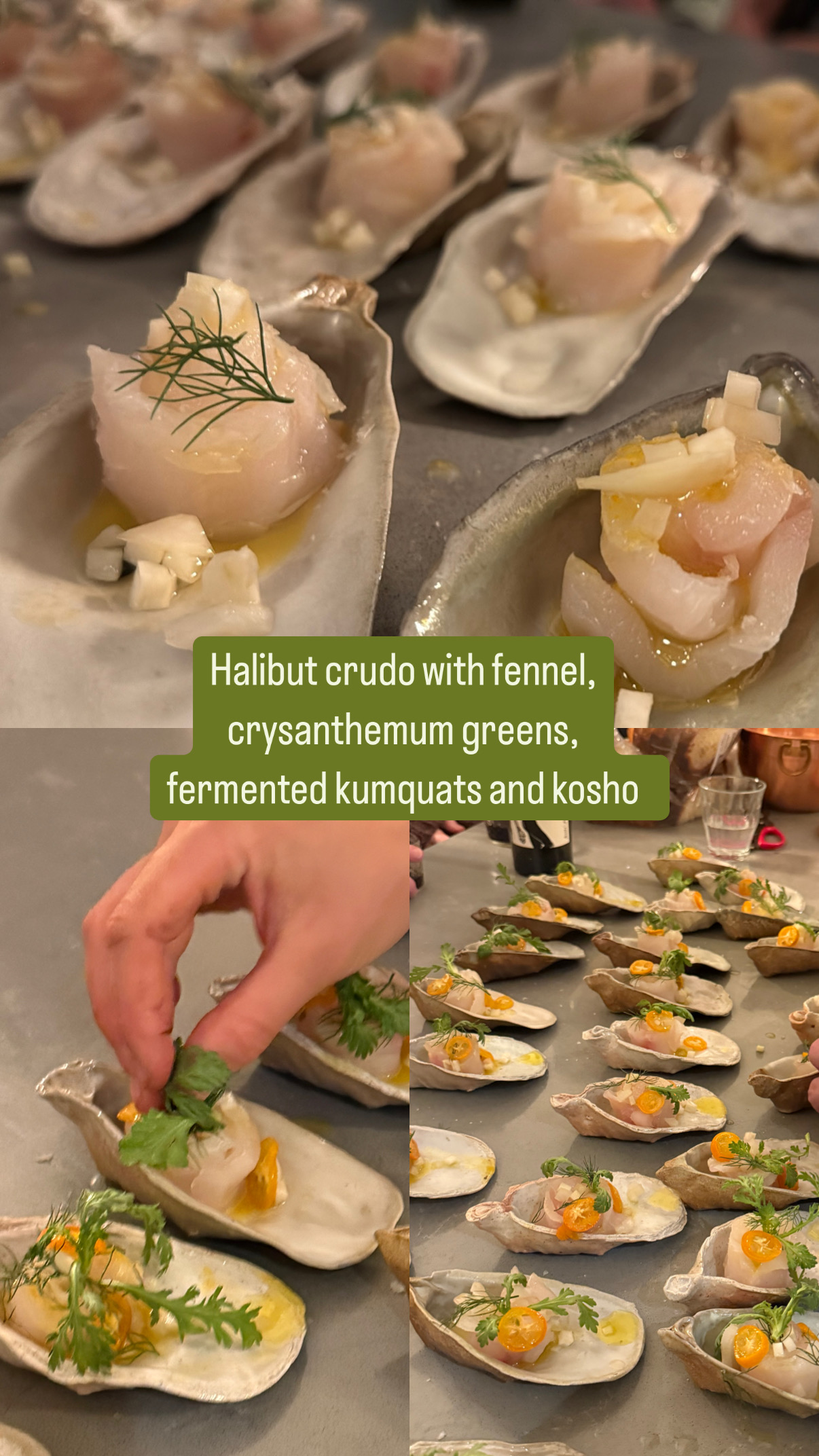 Pickled fennel, chrysanthemum greens, fermented kumquats in honey, kumquat kosho, maldon salt, dehydrated pickle brine and Meyer lemon–pink peppercorn oil. Served in ceramic oyster shells—made by Seamus at the Cultured Pickle Shop. His work can be found on display in the shop! This was a delicious bite to wake up the palate.