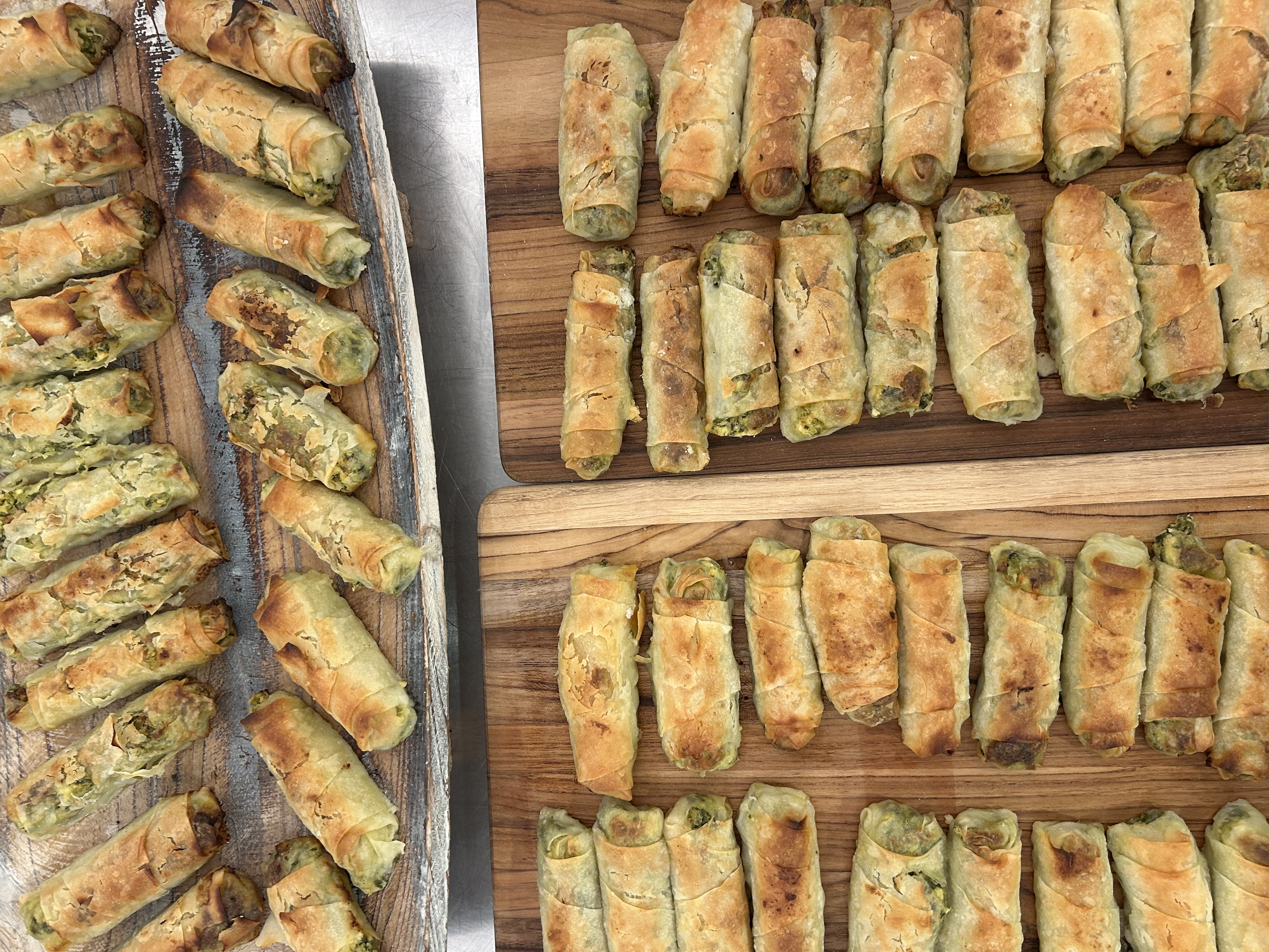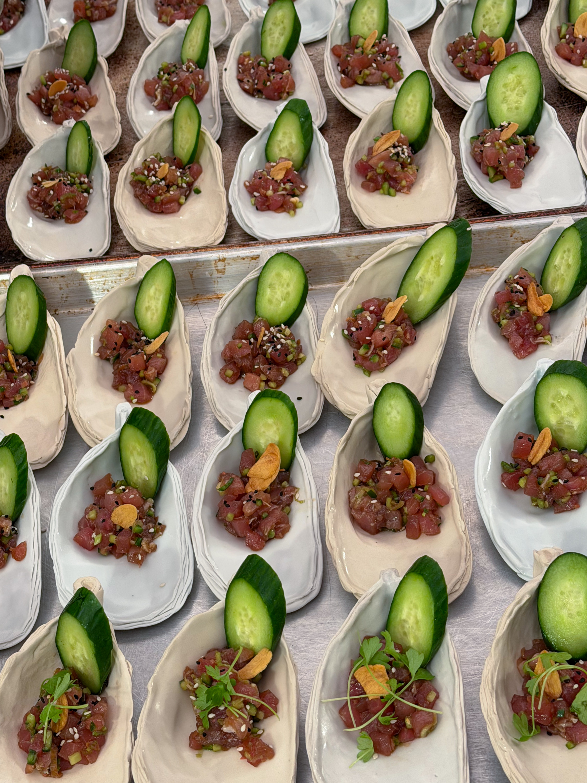 Tuna poke came dressed with ponzu, green onion, cucumber, fried garlic, micro celery, and Sichuan pepper oil and salt. Burekas followed with mustard greens, Chinese celery, Bulgarian feta, beyaz peynir, and kashkaval.