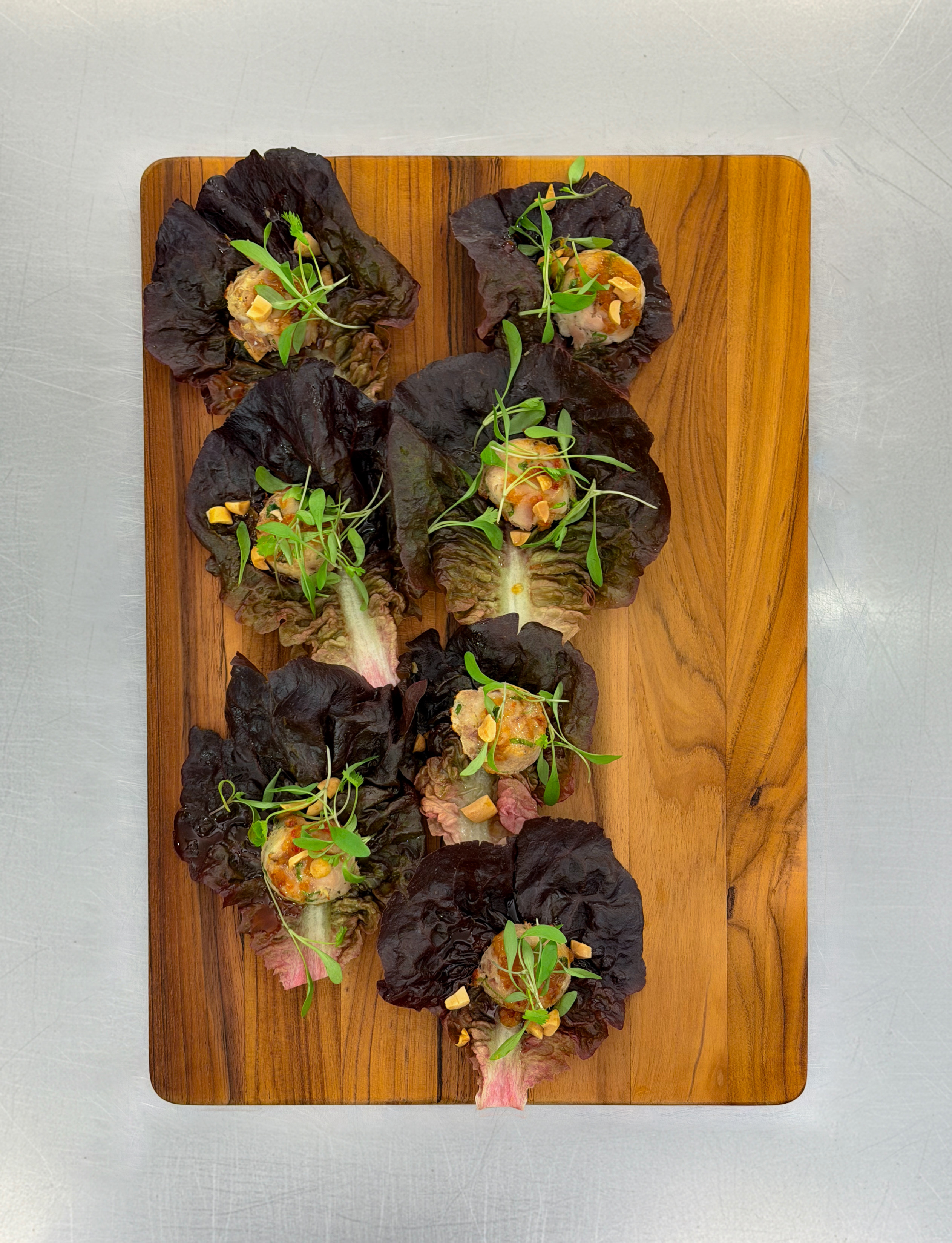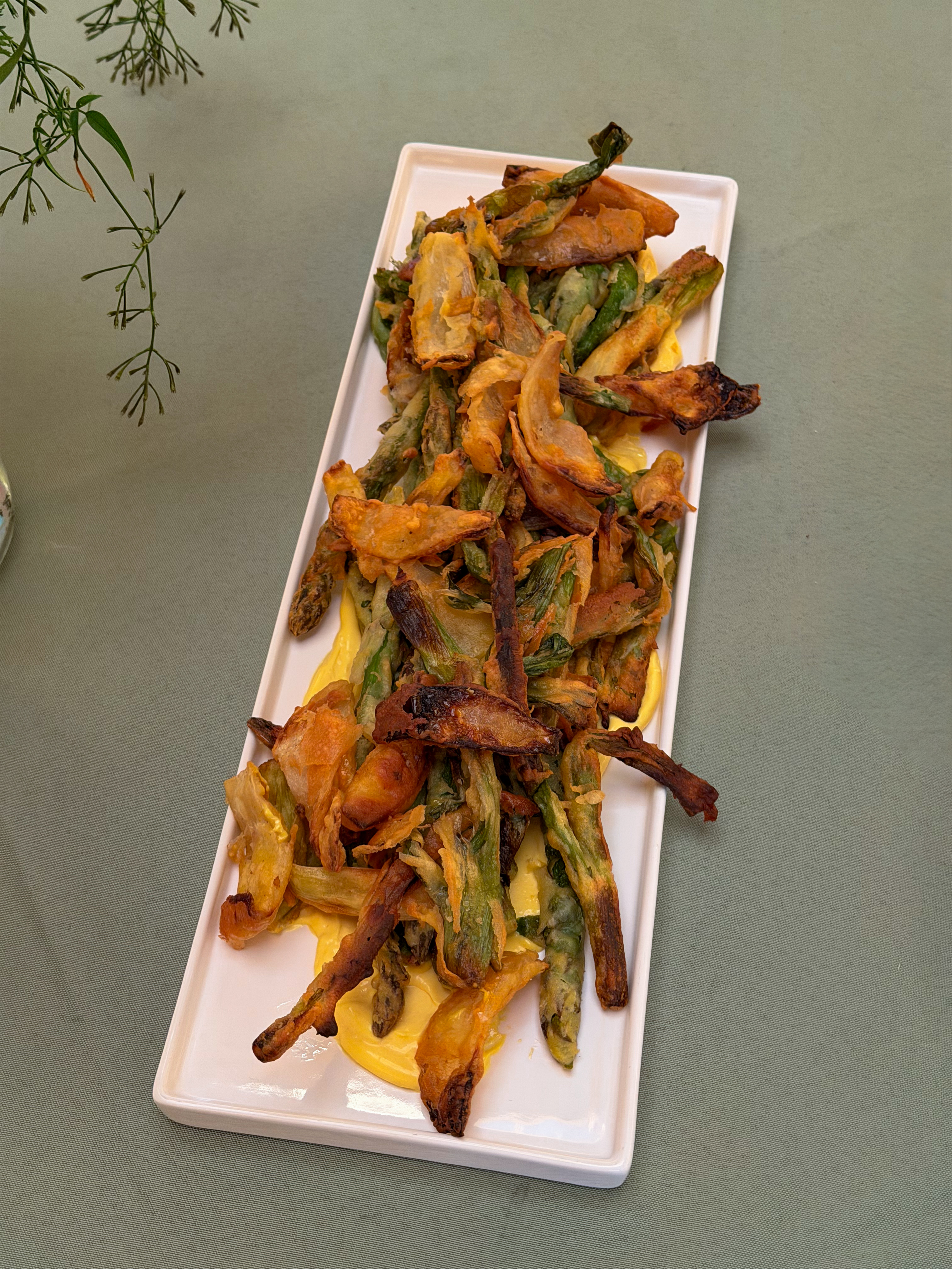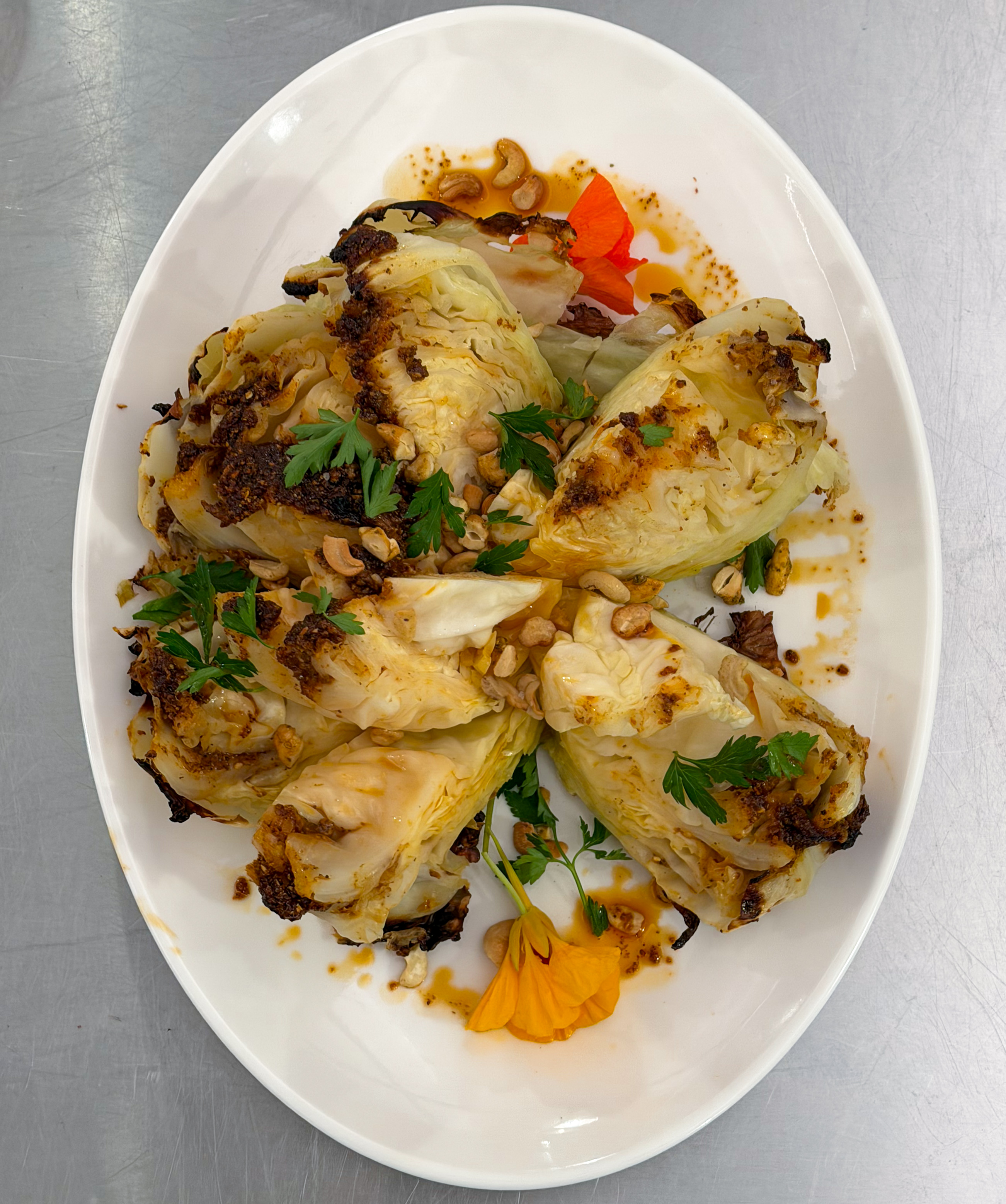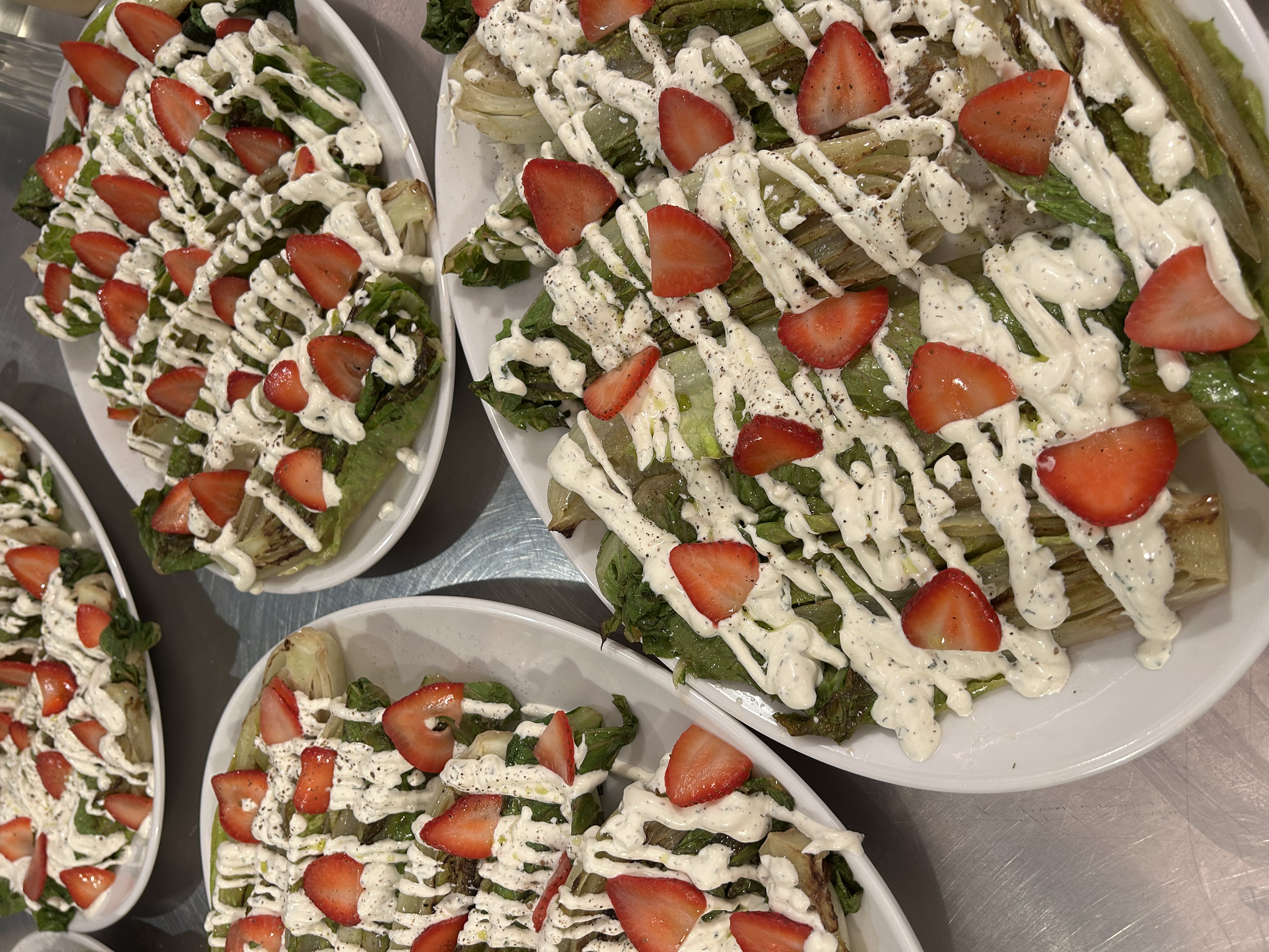 The center of the meal was cabbage blossom with chermoula glaze and peppercorn cashews, grilled romaine with peppercorn-pickled strawberries and peppercorn ranch, and fried vegetable medley with saffron aioli and charred lemon.